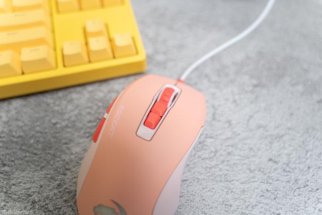 鼠标左侧拥有两个红色的侧键,大拇指握持处设计了一个凹陷,握持鼠标时大拇指正好可以放置在这个凹陷处,上方则拥有滚轮键和DPI+/-按键,用来方便的免驱鼠标调节DPI。鼠标的滚轮为橡胶轮,手感不错,滚动时阻力适中,定位感很强。