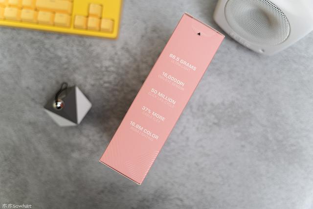 背部则标识了主要特点,侧面也标注了传感器的主要特性,不过可惜是全英文的。。。以我仅存的那点英文水平勉强可以认出66.5g超轻量设计,16000 DPI、5000万次按键寿命、寿命增加37%的柔性线缆、1680万种颜色。