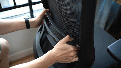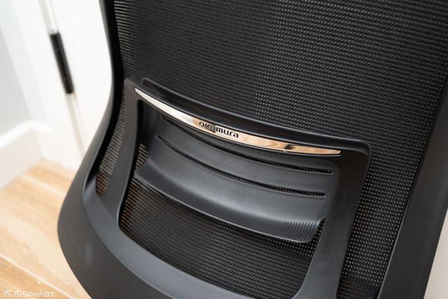 椅背上的网布直接覆盖到了侧面的框架,因为和边框颜色一致,所以一体感很强,背面框架是一体成型的柔性双重框架,中部则是一个比较柔软的黑色腰靠,腰靠可以为腰部提供更好的支撑,其上还有个“Okamura ”的银底黑字标志,腰靠的高度可以上下手动调节,方便使用者根据自己的身高调节到合适的位置。