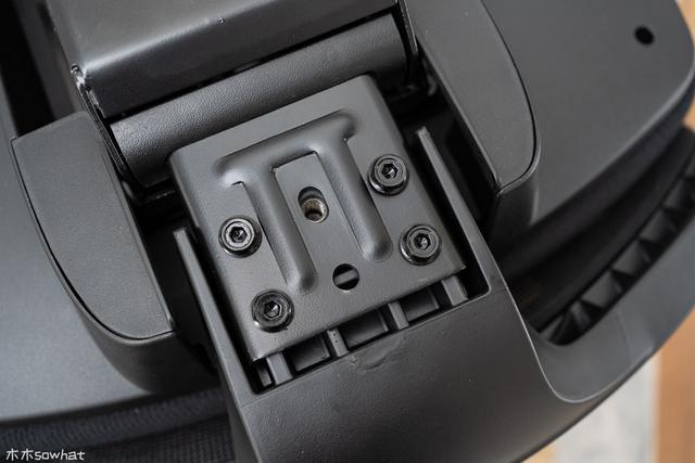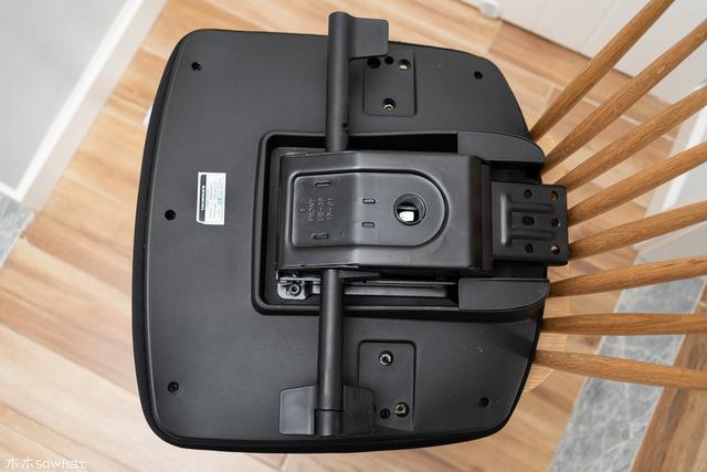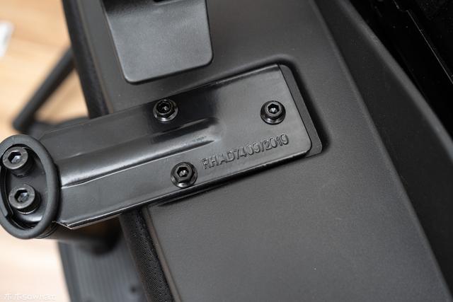 坐垫的底部用料还是比较扎实的,可以看到连接椅背部位的钢板相当厚实,左右两部分设置了两个拨杆,左侧的两个键位集成在一起,两个拨杆一左一右在视觉上形成了对称,整体看起来比较简约美观,不像别的坐椅那样斜着旋转,显得杂乱。