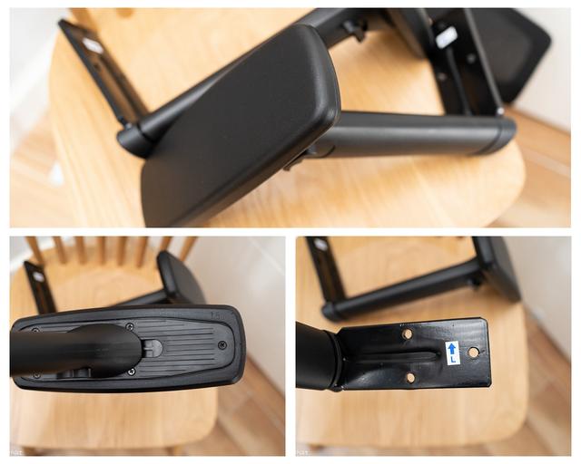 冈村Portone 的扶手也为黑色,用料也比较扎实,放置手臂的位置还比较柔软,能给手臂提供更舒适的支撑,和椅子连接的部件则为厚钢板,看起来就很结实。
