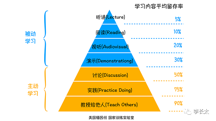比如,你去游泳班学习游泳,一共有6节,每节课1个小时。那一般来说,肯定是教练先花5-10分钟给你做一下讲解一下姿势和动作,然后让大家下水练习,有问题再问教练,课后再总结反思一下。等下节课再给大家讲新的东西,再下水。 而不可能是先集中两堂课在教室给大家讲理论,后面四堂课再下水。在学习过程中,不要花了一两个月学习,然后再用两三个月去实践。而是要建立小的获取知识、实践知识、解决问题的循环。我建议以一周为单位,比如我在一周内花了3天看了一本书,请教了一位老师,然后这周用其余四天去实践,解决问题,然后做一个总结。如果你想成为一个领域的高手,就一定要进行大量输出和分享。我们先看看这张图,在这张图的最底端我们可以看到,将知识教授给他人,是一种主动学习的方式,学习知识的留存率可以达到90%以上。
