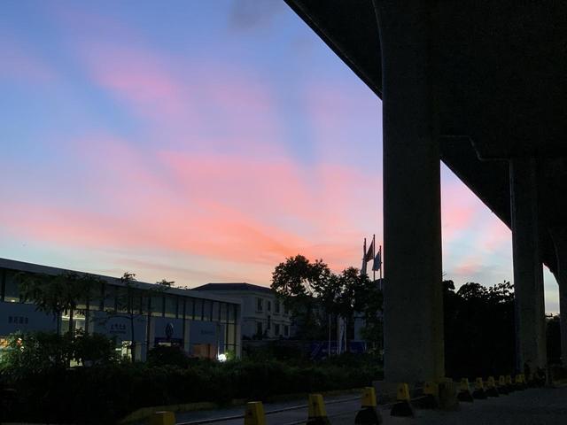 在端午收假回家的路上,正在玩手机的我突然被眼前的画面所吸引:天空由远到近,从天青色过渡到深蓝色,再加上粉色的晚霞漫布其中,我一边记录一边感叹大自然手中画笔的神奇。