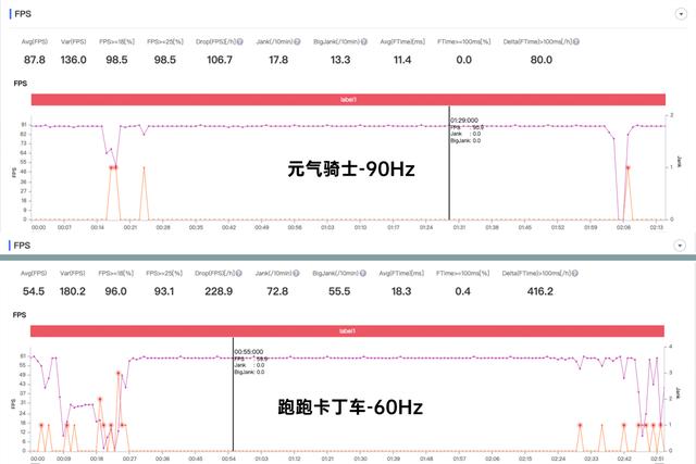 至于前面讲到的游戏体验,90Hz的刷新率和180Hz的触控采样率,让游戏的过程更加顺畅,我使用帧率测试软件分别记录了60帧和90帧下不同游戏的帧率波动,可以明显看到,除了在游戏开始和加载过程中出现的卡顿,在游戏开始之后整体的游戏体验都非常流畅,画面几乎是一只稳定在峰值帧率,可见其背后的优化还是做的比较到位的。