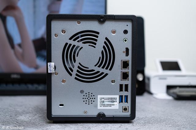 背部有一个散热风扇,为整机的硬盘提供散热,接口上提供了两个千兆网口、两个USB2.0接口、两个USB3.0接口,电源接口和3.5mm音频输入输出接口,还提供了一个HDMI接口。