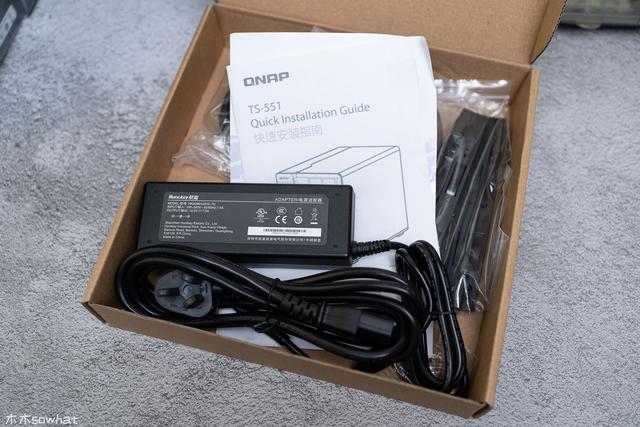 NAS配件上包括电源适配器、硬盘固定螺丝、说明书、保修卡等。外置电源适配器,12V-7A,总共84W的功率,再大的硬盘也够用了,电源外置也有助于保持NAS机身的轻巧。