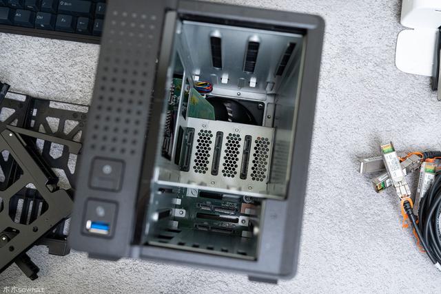 拔出硬盘仓可以看到内部构造,机身右侧为内存插槽,主板位于机身左侧,做工精致,有台系大厂的风范。