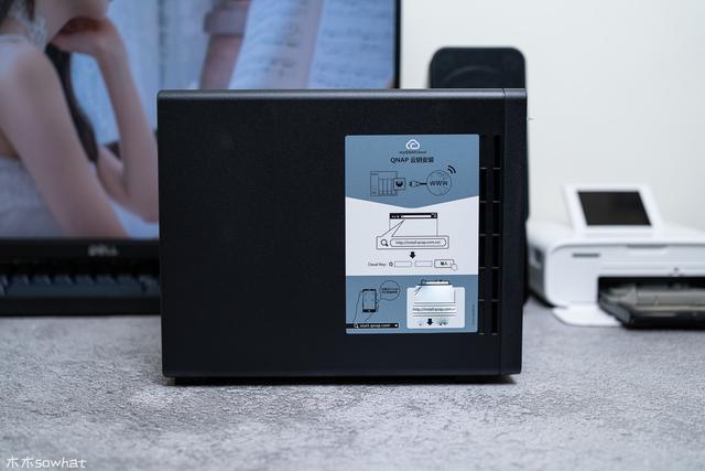 顶部有型号贴纸,侧面则是快速安装系统用的贴纸,可以直接通过手机进行安装,这也算是威联通的一大特色。
