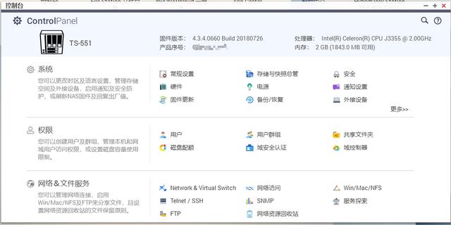 在控制台中可以看到各类系统选项、权限设置、网络及文件服务等等,基本上要进行设置的功能操作都这里面了。