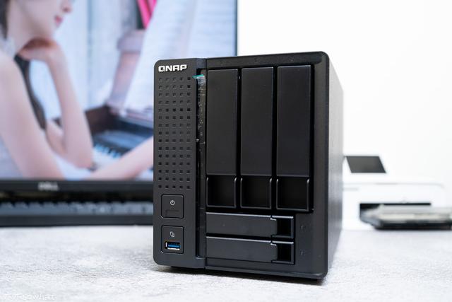 TS-551的个头还是比较紧凑的,整体黑色的机身稳重有余,五个热插拔盘位占据了面板的绝大部分面积,前面板最左侧采用小方框内凹设计,若干工作指示灯则隐藏在硬盘仓左侧,还有电源键、复制键、一个USB3.0接口,可供USB设备一键备份之用。