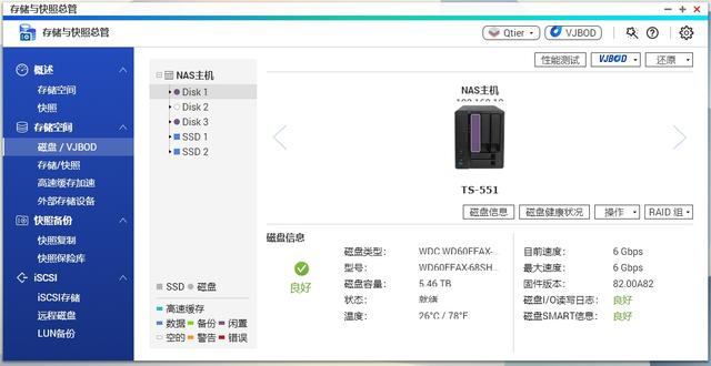 磁盘和快照管理工具——存储与快照总管,这里要表扬下QNAP的细节,插入硬盘界面内对应的硬盘位会显示蓝色,硬盘位置和状态一览无余。