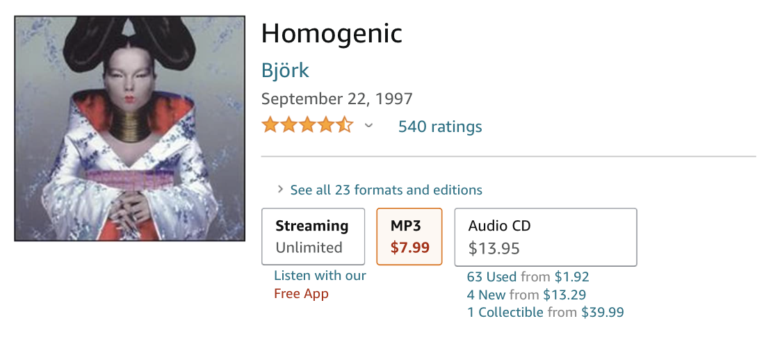 亚马逊的数字音乐服务也许不常被人提起,不过就跟 Prime Video 一样,虽然看着土气,但有时候也是好用而可靠的选择。如果你在非国区的亚马逊商店搜索过音乐专辑相关的内容,多半曾经见过这个「mp3」选项,这就是亚马逊销售的 DRM free mp3 音乐。与 iTunes 不同,亚马逊提供的数字音乐下载一律是 256 kbps 的 mp3 文件,音质上可以满足日常收听需求,优势是价格有时会比 iTunes 便宜一些,而且 mp3 格式的音乐比 AAC 要更加通用。此外,亚马逊上有时会有一些地域性较强的音乐内容是在其他平台所找不到,或者很难获取的。例如我曾经在德国亚马逊上买到过一张德国的儿童歌曲专辑,这张专辑除了亚马逊就只有徳区的 iTunes 上可以买到,但是注册一个徳区的 iTunes 帐号并且搞定付款方式,对于中国大陆居民的我来说异常困难,在这种时候亚马逊就成了唯一的选择。