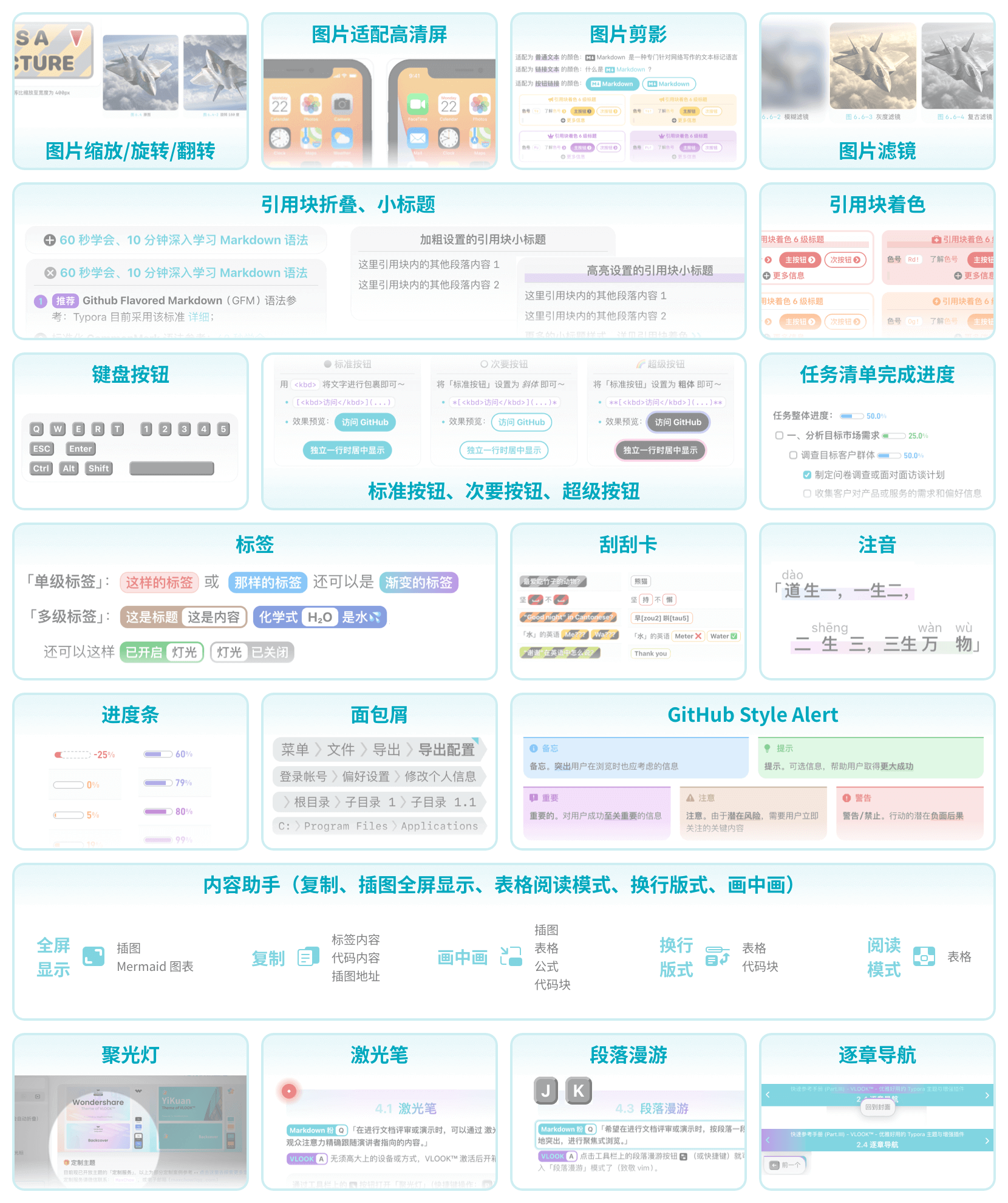 VLOOK™ 通过扩展 Markdown 的功能和样式,为用户提供更优雅、实用的文档编辑和展示体验,支持 文档排版、内容标记、内容导航、演示辅助 和 交互体验 等功能,适用于文档写作、知识管理、演示文稿制作等多种场景。