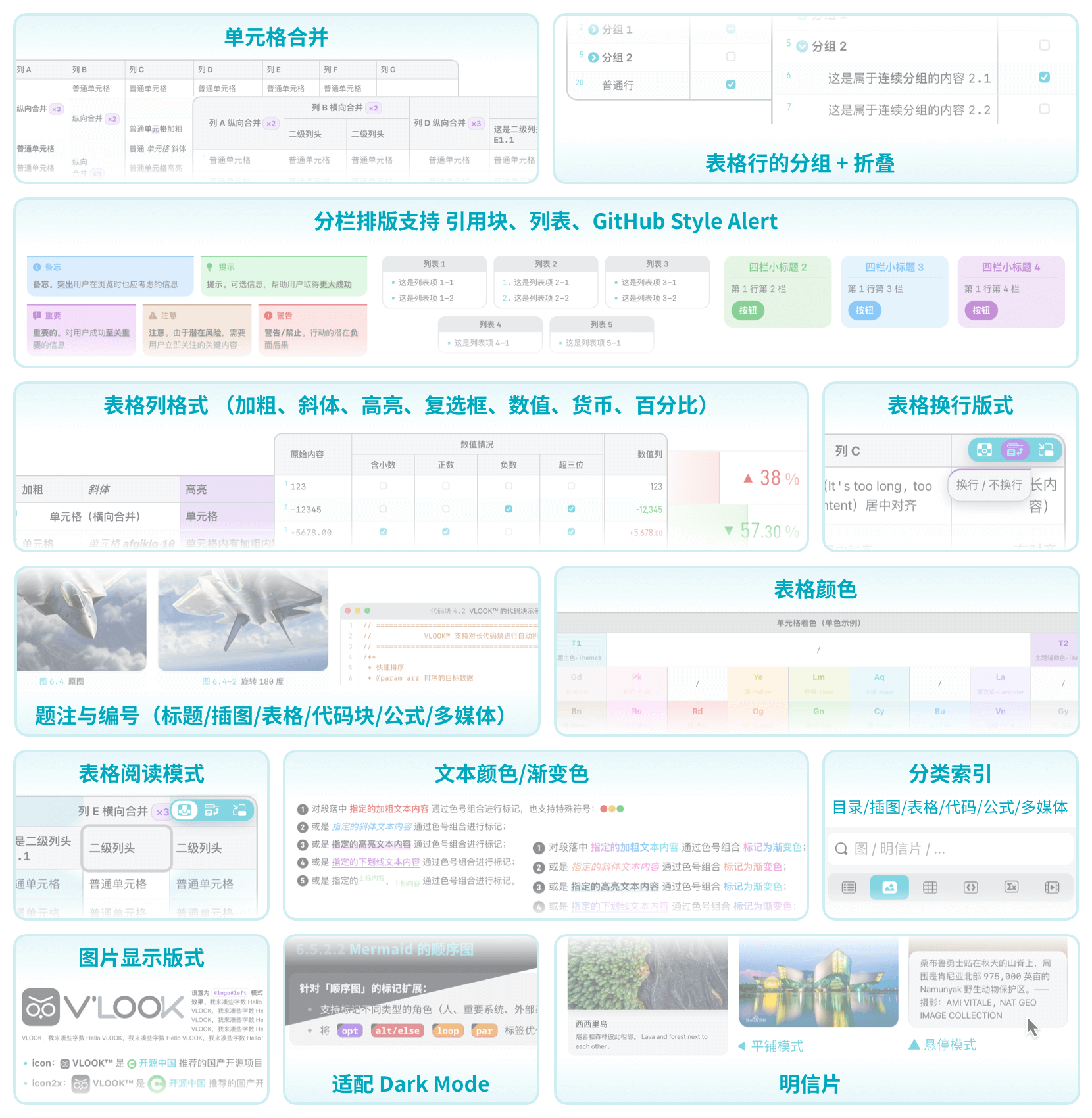 你是否也厌倦了 Markdown 文档千篇一律的排版和体验?VLOOK™ 在保持 Markdown 优雅的同时,还能让你编写的文档焕然一新。
